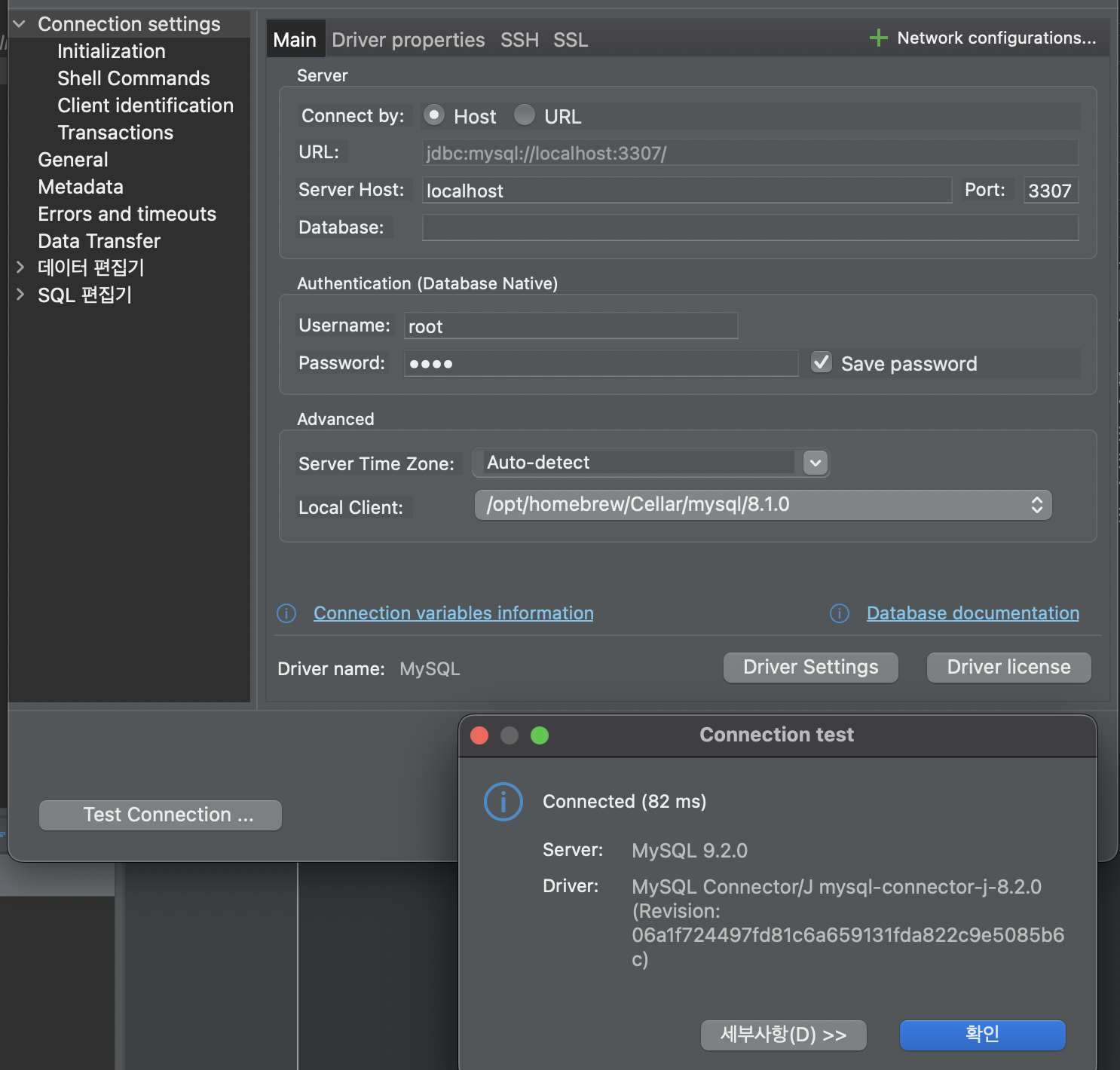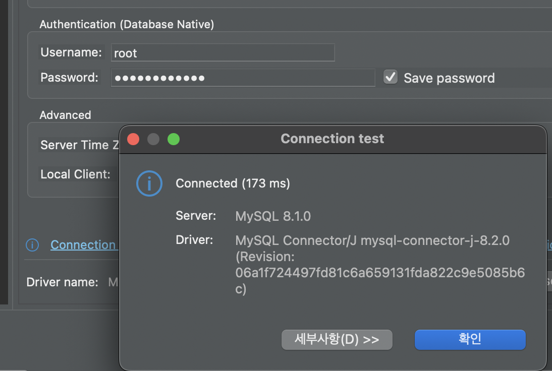 혹시나 해서 기존 로컬 MySQL에서 사용하던 비밀번호를 입력하니 연결이 된다.