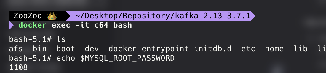`실행 중인 해당 컨테이너에 접속`해서, 환경변수 `MYSQL_ROOT_PASSWORD`를 확인해 보니